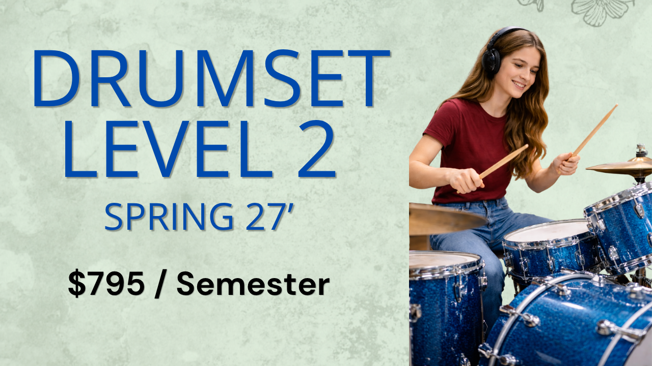 Expand your Drumset playing through multiple musical styles including; swing, funk, rock and world grooves.  Learn how to solo and move around the kit more freely and musically. There will also be opportunity to learn songs of your choosing. Ultimately student’s leave this course feeling much more confident in their ability to play in a live band and have more freedom to play the music they’ve always wanted to. Upon course completion you will receive all necessary documentation to apply for High School Fine Arts Credit (0.5 credit).