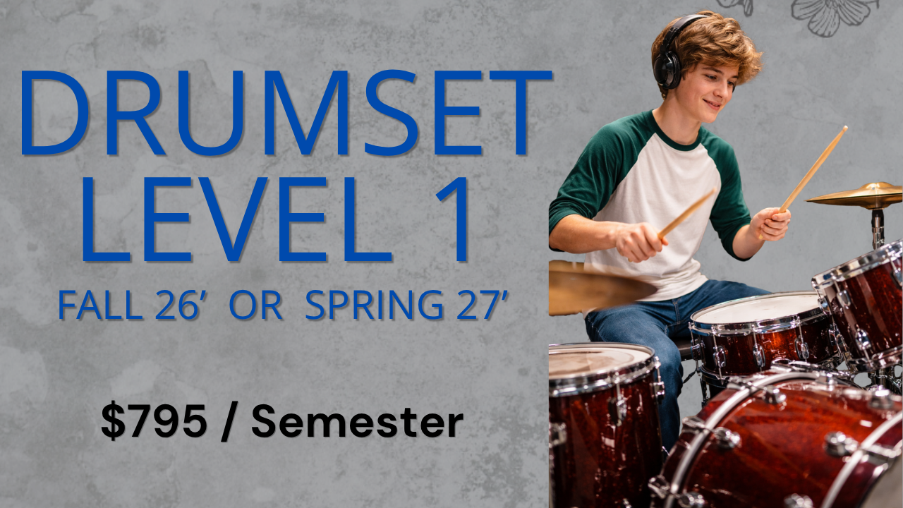 In this course you’ll learn drumset fundamentals, including technique and coordination development through simple grooves and exercises. We’ll also learn how to read drumset notation and play with solid time and feel. This course dives right into drumset and is perfect for students who have some experience playing drums but haven’t dived into drumset much yet. This course is not for students who have never played drums before as we don’t dive into basic stick technique and hand development. For students with no prior experience playing drums I recommend starting with “Snare Drum Level 1” as a precursor to Drumset level 1. Upon course completion you will receive all necessary documentation to apply for High School Fine Arts Credit (0.5 credit).Â